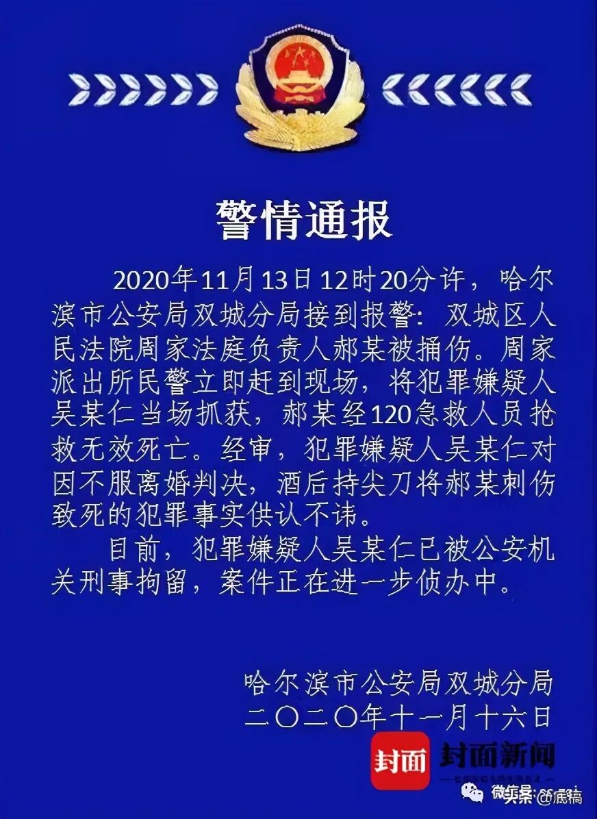 11月16日下午,哈尔滨市公安局双城分局发布警情通报称,该案的犯罪嫌疑人吴某仁酒后刺伤他人致死,已于事发当天被当场抓捕归案,目前已被刑事拘留。死者郝某系双城区人民法院周家法庭负责人。
